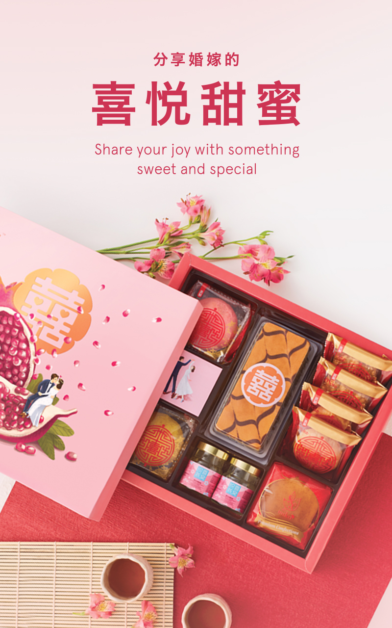 一则喜讯就此诞生!喜饼代表着一份爱的宣言,准新人的父母藉由这份装载着喜悦甜蜜又不失传统好味道的喜饼送给所有 亲朋戚友,让他们共享这份婚嫁喜悦。